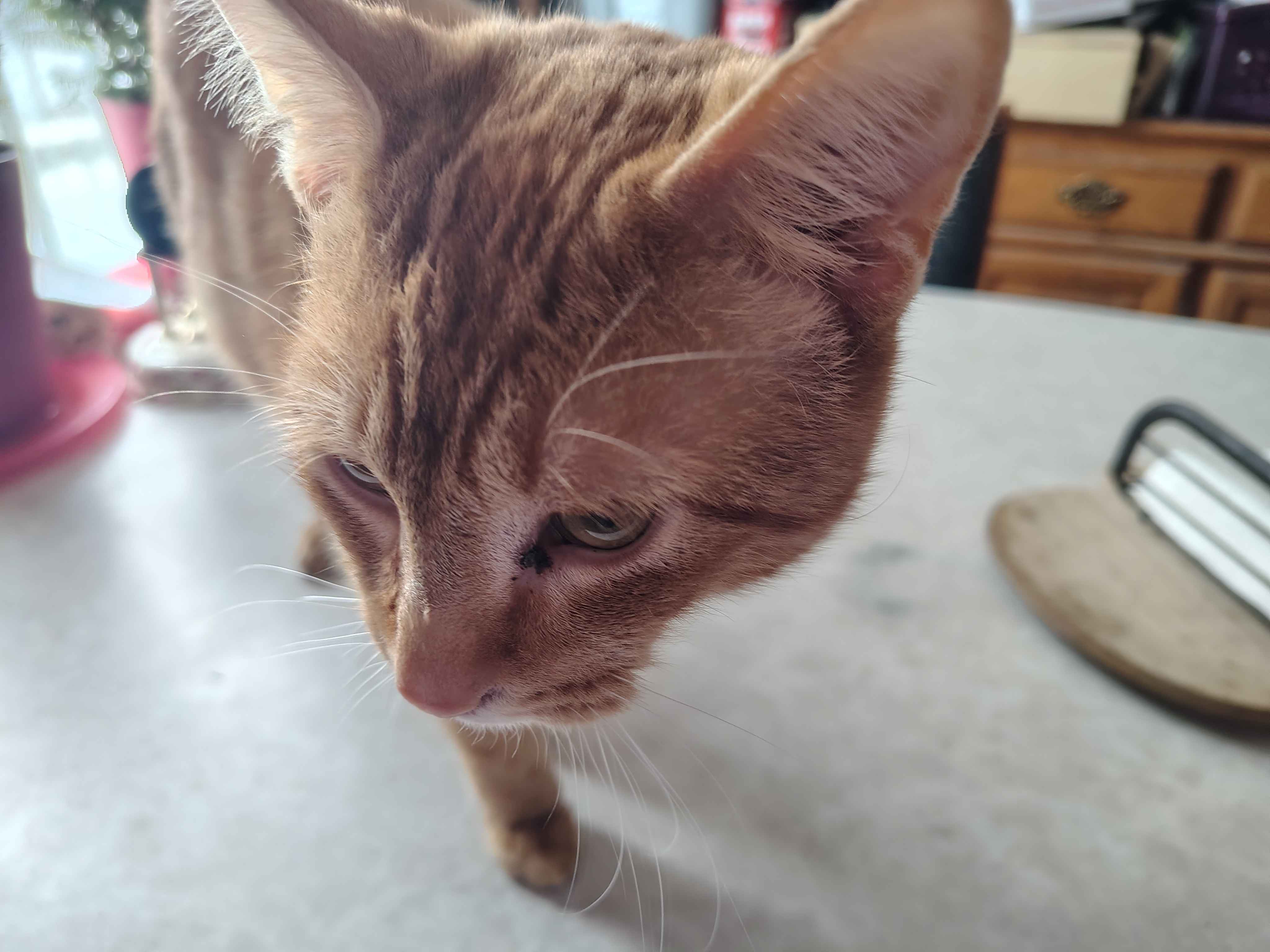 Morris, the day after he got hurt. Behaving as a cat does, sniffing and exploring the dining room table.