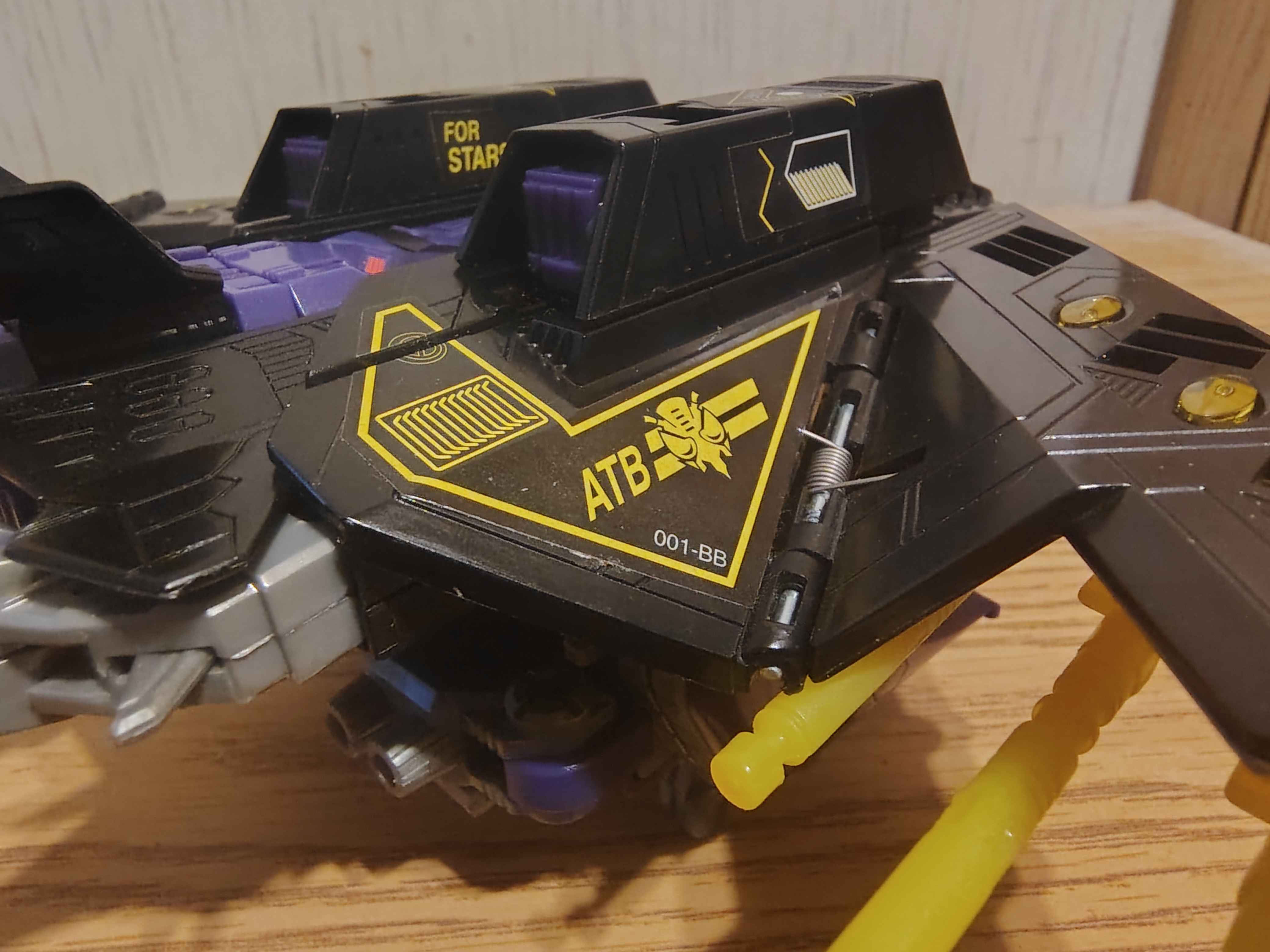 And he also combines with Starscream (by inserting Starscream into his rear - helpfully labelled with preapplied stickers reading 'For Starscrem [sic]') resulting in a more complete-looking stealth bomber (it is impressive how the shared deco makes the complete stealth bomber mode look cohesive) and then when you remove Starscream, it automatically flips BB's wings up. Which not only is the first step involved in transforming him into his robot mode, but also the first step in transforming him into his tank mode.